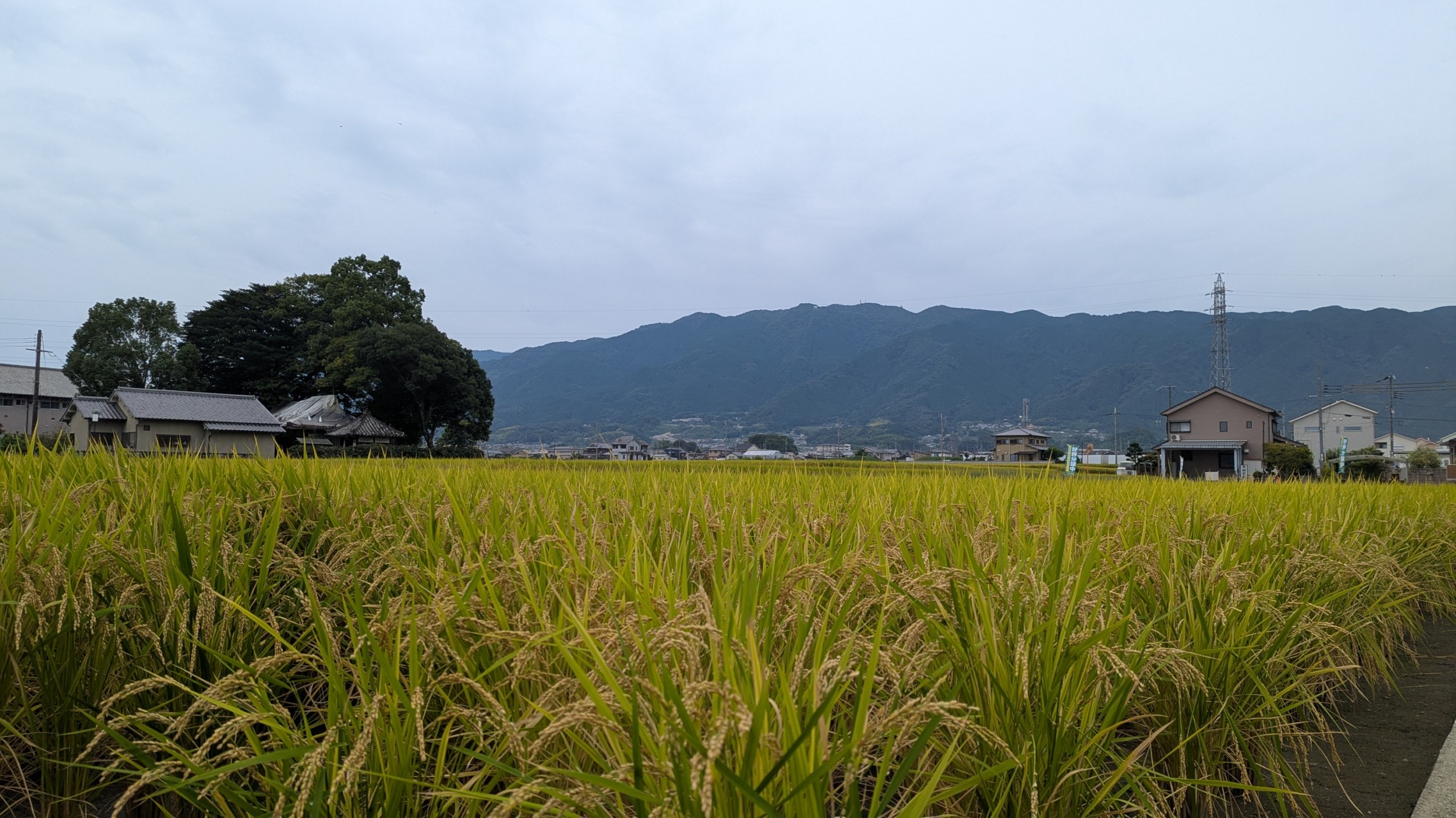 先日郵便局に行ったときの道中の様子です。奈良県のヒノヒカリは結構収穫時期が遅くて、10月中旬~くらいに収穫のようです。これがおわったら籾殻ピラミッドがあちこちにできて紅葉がはじまります。